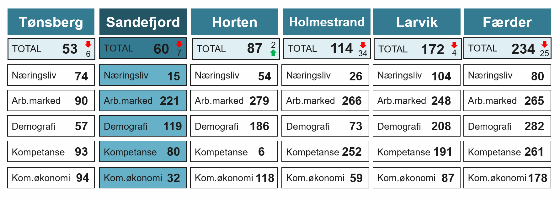 Sandefjord utmerker seg spesielt på temaområdet næringsliv; som soleklar ener i fylket og en imponerende 15. plass nasjonalt. Kommunen har høy næringsvariasjon og en andel privat sysselsetting på 77,5 %, noe som viser et mangfoldig og robust næringsliv med godt grunnlag for videre vekst.